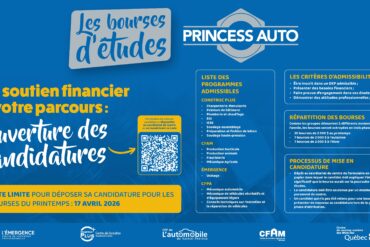 Bonne nouvelle pour les élèves inscrits en formation professionnelle! Plusieurs bourses de 2 000 $ sont offertes afin de soutenir la poursuite de leurs études. Si tu es actuellement inscrit dans une formation professionnelle admissible, tu peux déposer ta candidature dès maintenant en remplissant le formulaire suivant : Formulaire_bourse IMPORTANT : Le formulaire doit être imprimé […]